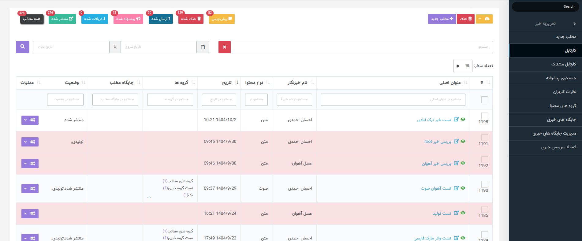 میتوانید تعیین کنید که در کارتابل بهصورت پیش فرض اخبار با چه وضعیتی نمایش داده شوند و در کارتابل مشترک تمامی اخبار با هر وضعیت قابل مشاهده باشند.