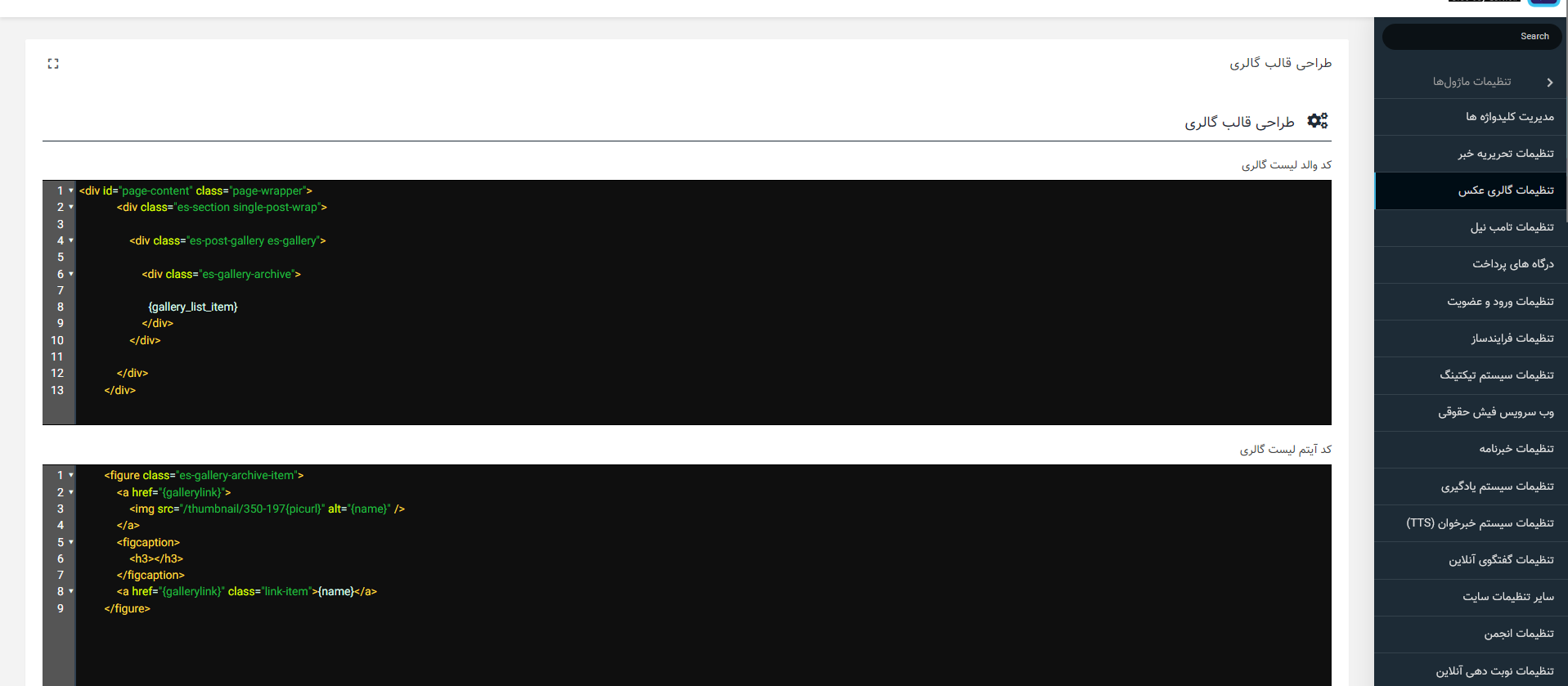 وارد بخش تنظیمات گالری عکس شوید و کدهای مربوط به قالب نمایش گالری را در باکسهای مربوطه تکمیل و ذخیره نمایید.