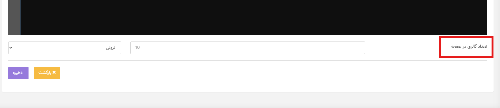 در انتهای صفحه، اطمینان حاصل کنید که فیلد «تعداد گالری در صفحه» مقداردهی شده باشد. در صورتی که این فیلد خالی باشد، صفحه نمایش گالری ممکن است با خطای 404 مواجه شود.
